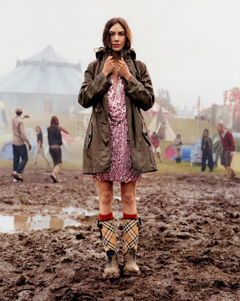 Las imágenes fueron tomadas en típicas escenas de un festival británico, muy al estilo Glastonbury: barro, carpas, autobuses de gira, backstage y lluvia. La firma se encargó de vestir a los protagonistas para la ocasión, luciendo prendas como parkas, gabardinas y botas de agua.