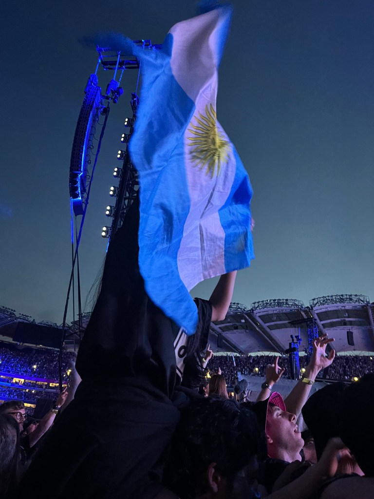 Ahora sí, estamos a mitad de show. Noel pregunta: “¿Alguien de Manchester?”. La gente abuchea, y un sorprendido Noel les recrimina: “Excuse me? EXCUSE ME? Booing for the people in Manchester? Oh no, no, no, no, that won’t do! Be nice!”. Fue realmente un momento muy divertido, que precedió a una de las canciones que más veníamos a escuchar. Mientras Noel dedica la canción a la familia Royle, “la verdadera familia real”, en clara burla hacia los de Windsor, y el sol terminaba de ocultarse, la banda comienza a tocar los acordes de la canción que nos identifica a los que pausamos nuestras vidas para ir del otro lado del mundo a presenciar ese momento. En la previa y en el show vimos banderas de Argentina, Ecuador, Colombia, Brasil. Cientos de latinoamericanos que, aún sintiendo las señales de alerta dando vueltas en nuestras cabezas, allá fuimos… Half the World Away. Nos perdimos, nos encontramos, pero no nos sentimos mal.