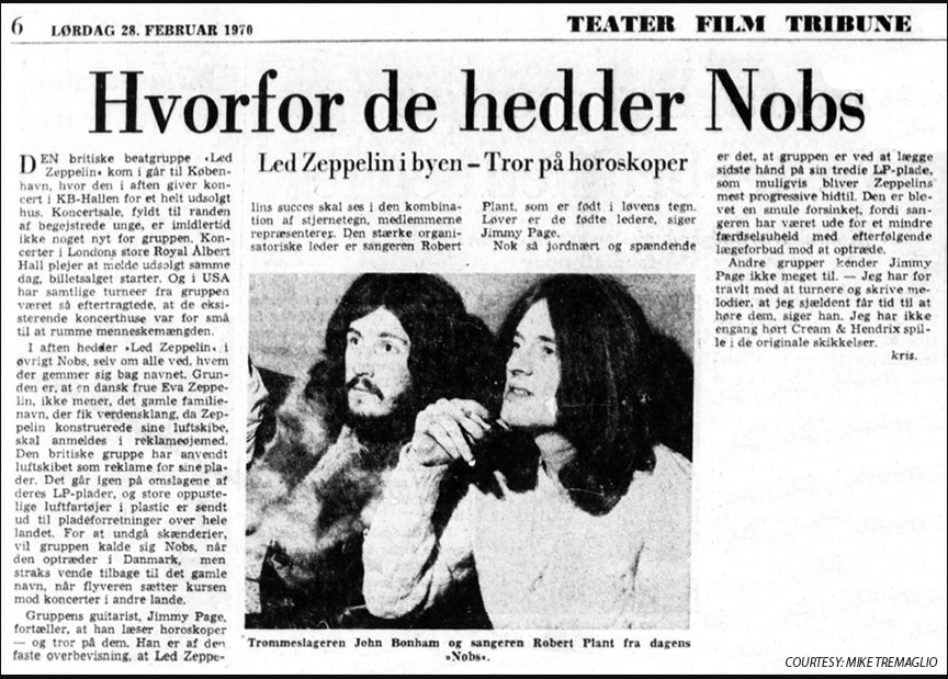 Este es uno de los casos en donde el cambio de nombre se dio por temas legales. En 1970, Led Zeppelin había acordado una serie de shows en Dinamarca. Pero al llegar, se encontraron con un problema: a la baronesa Eva Von Zeppelin, heredera del conde Ferdinand Von Zeppelin, no le gustaba para nada que la banda usara su apellido, por lo que en un principio los citó para conocerlos y ver qué onda. Todo iba bien hasta que la aristócrata vio la tapa del primer disco de Zep, con una foto del invento de su padre en llamas. Ahí se puso firme y les prohibió mediante una denuncia penal utilizar su apellido en su país. Es por esto que para estos shows Led Zeppelin se llamó The Nobs, en homenaje a Claude Nob, su tour manager.